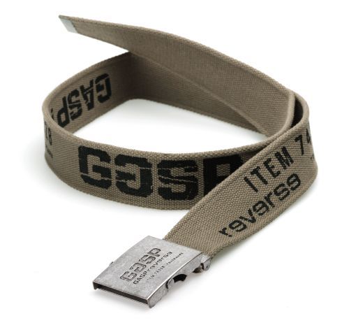 Ремень из плотного брезента с застёжкой армейского образца. Регулируй длину ремня в зависимости от того, масса у тебя сейчас или сушка. Можно использовать обе стороны ремня - одна с массивными буквами, а другая с буквами обычного размера. Ещё один аксессуар в стиле GASP - и подойдёт к любой атлетической талии!