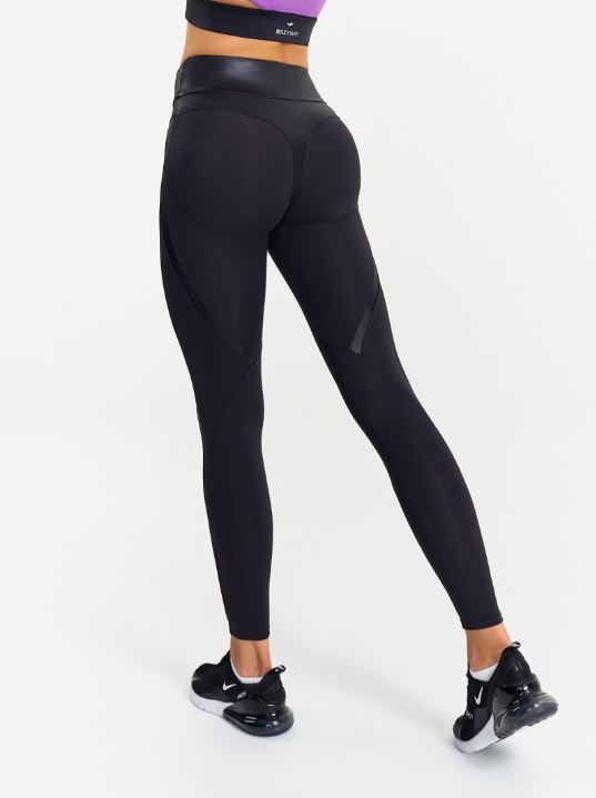 Леггинсы для фитнеса из двух видов спортивного трикотажа. Основной материал- плотный, матовый, не просвещается; декоративные вставки и пояс из блестящего бифлекса. Контраст в деталях хорошо подчеркивает формы тела. Пояс выполнен из двойного бифлекса, благодаря этому создается усиленная поддержка поясницы и живота.