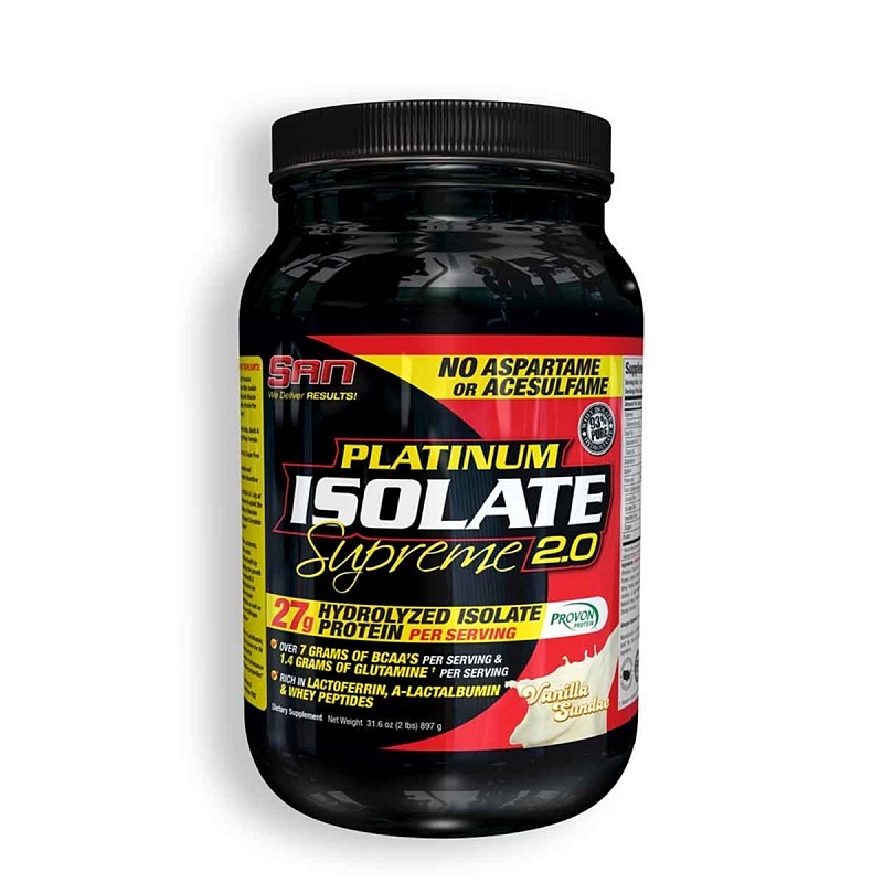 Platinum Isolate Supreme содержит: глютамин, аминокислоты с разветвленными цепочками, цистеин, минералы, лактальбумин, лактоферрин и питательные вещества, повышающие уровень глютатионина, который поддерживает иммунную систему. Формула, не содержащая жиров, сахара и лактозы, поставляет 27 грамм матрицы сывороточного изолята Ультра Премиум, включающий в себя сывороточный протеин гидролизат и изолят, который содержит никзко-, средне- и высокомолекулярные пептиды, необходимые для быстрого поглощения и набора сухой мышечной массы.