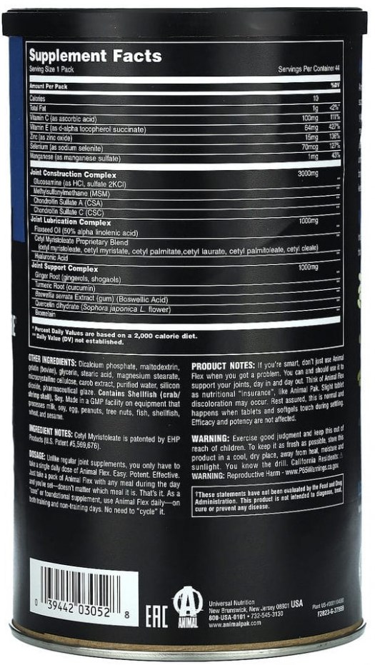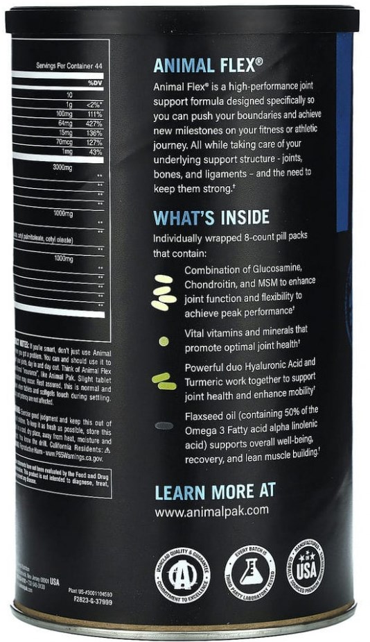Animal Flex разработан, чтобы помочь укрепить ваш фундамент, ваши суставы. Каждая порция (пакет) Animal Flex содержит нескольких основополагающих комплексов: