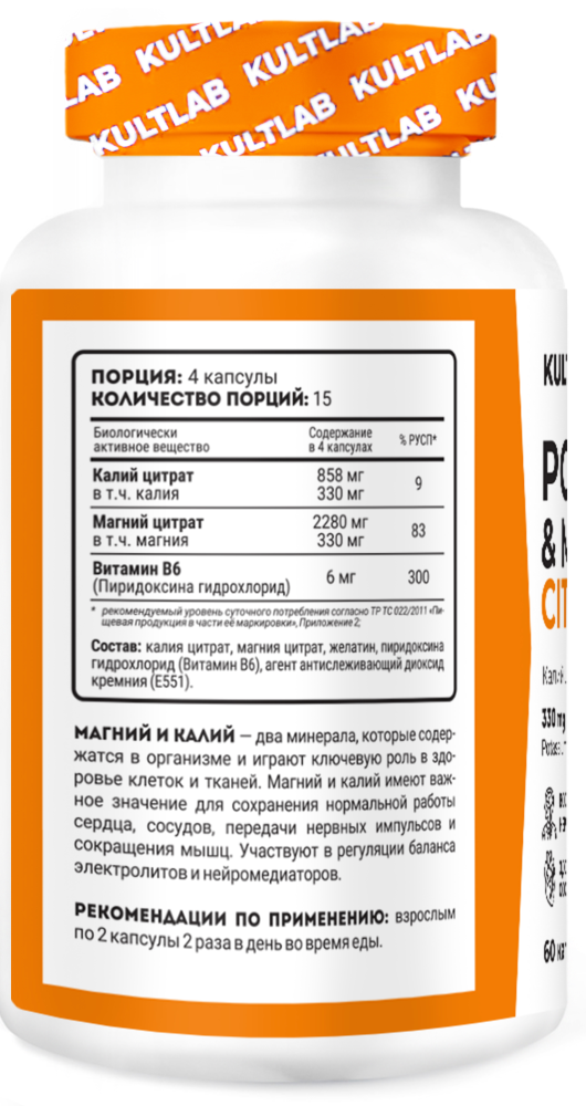 Магний и Калий от Kultlab - два минерала, котрые содержатся в организме и играют ключевую роль в здоровье клеток и тканей.Они имеют особо важное значение для сохранения здоровья сердца, нормальной работы сосудов, передачи нервных импульсов и сокращения мыщц. Играет роль в регуляции нормального баланса электролитов и нейромедиаторов.