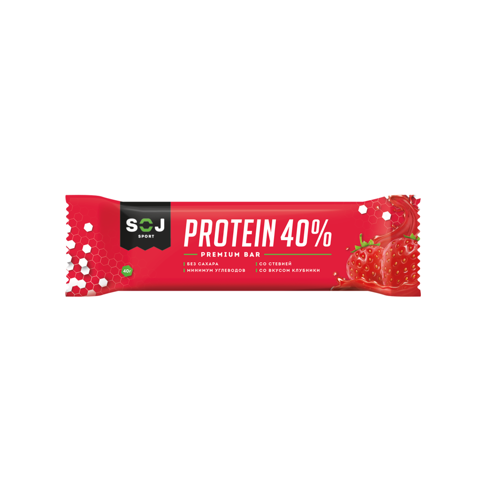 Протеиновый батончик "Sport SOJ" на молочном белке с высоким содержанием протеина в 40% и низким содержанием углеводов.