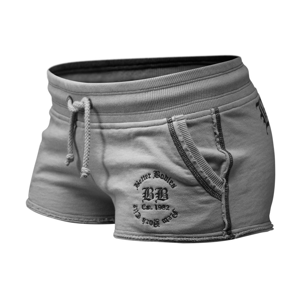 Короткие спортивные шорты. На пояс широкая резинка со шнуровкой. Спереди два кармана. На лицевой стороне слева изображена эмблема производителя. На задней стороне надпись "Better bodies" большими буквами.