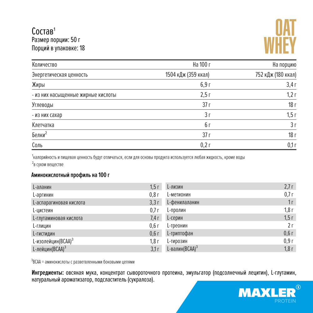 Oat Whey — содержит концентрат белка из сыворотки и овсяную муку, прекрасно усваивается организмом и дает длительный эффект.