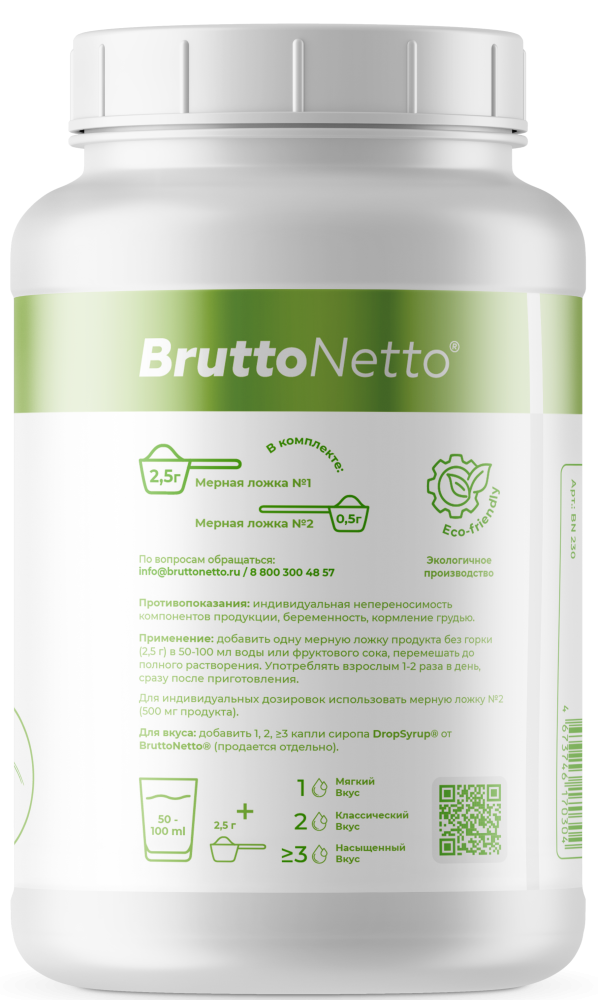 - Индивидуальный подход: В комплект входят две мерные ложки — одна на стандартную порцию 2,5 г, вторая для индивидуального применения 0,5 г.