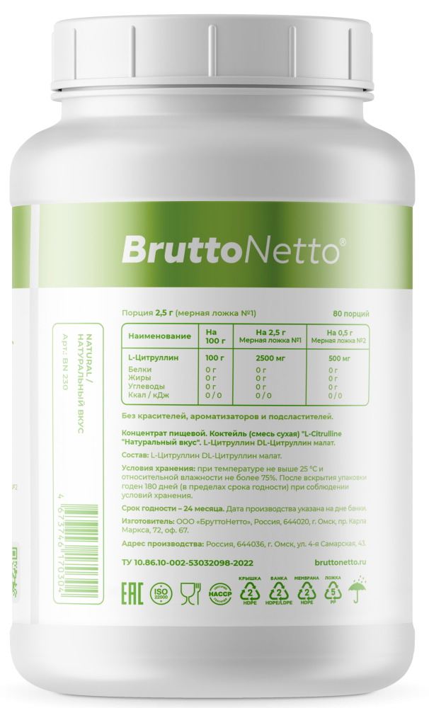 Погрузитесь в мир активного образа жизни с 100% чистым L-цитруллином от BruttoNetto! Наш продукт предлагает исключительно аминокислотный состав без примесей и инертных наполнителей, что означает, что вы получаете только самое лучшее для своего организма. L-цитруллин — это натуральная добавка без вкуса, идеально подходящая для поддержания физической активности и общего самочувствия.